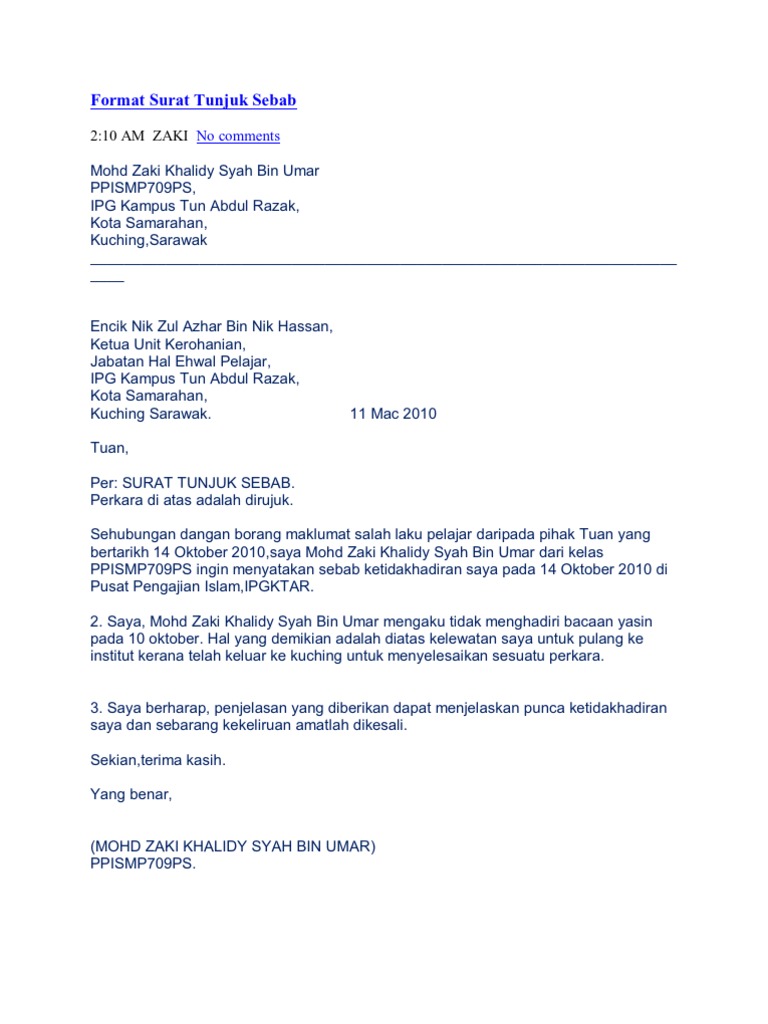 Surat tunjuk sebab ini perlu. Format surat tunjuk sebab di bawah ini dalam format rasmi. Pengurus TuanPuan SURAT TUNJUK SEBAB.
